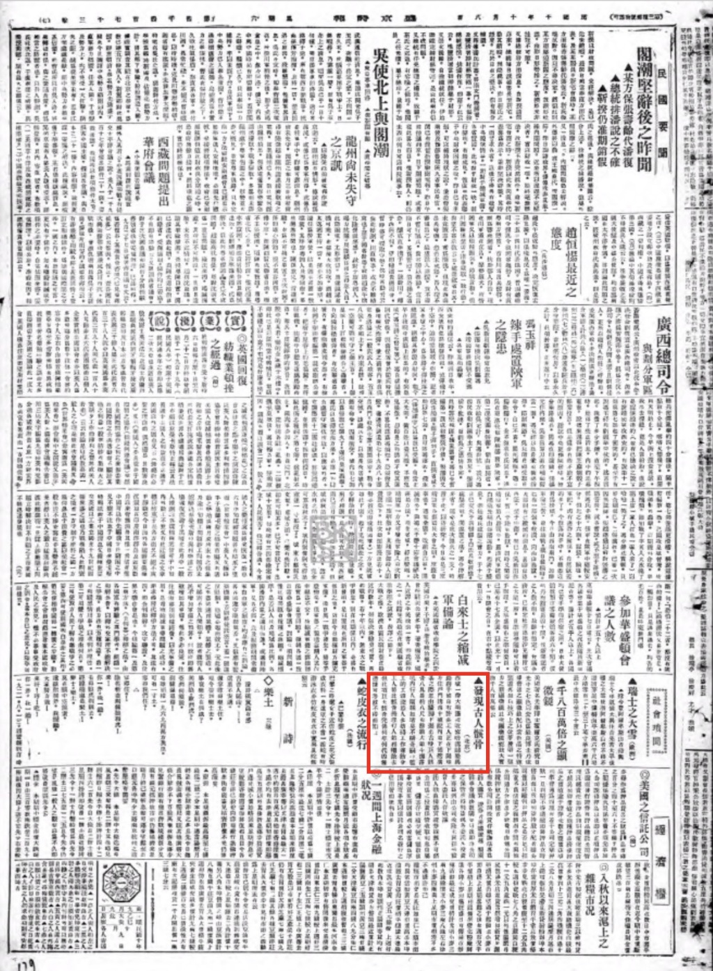 到這里,還有些問(wèn)題沒(méi)解決?!妒⒕r(shí)報(bào)》是沈陽(yáng)的報(bào)紙,怎么知道北京挖出了巨人骸骨呢?自然是從北京傳來(lái)的消息。那么,北京的這個(gè)消息又是從何而來(lái)?這件事到底是不是真的發(fā)生過(guò)呢?這就要去查當(dāng)時(shí)的北京報(bào)紙了。