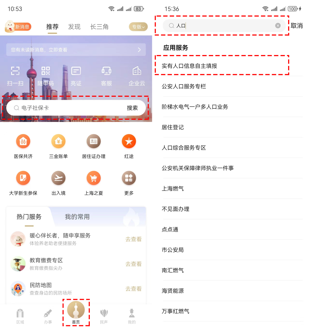 登錄“隨申辦市民云”APP→首頁搜索框中輸入“人口”→點擊“實有人口信息自主填報”進入服務頁面;