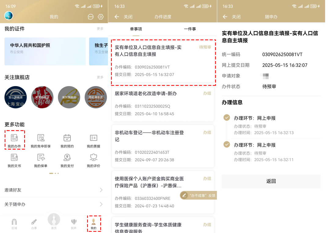 提交申報后,可以在“隨申辦市民云”APP→“我的”頻道→“我的辦件”服務中查詢辦理進度,了解登記是否成功。