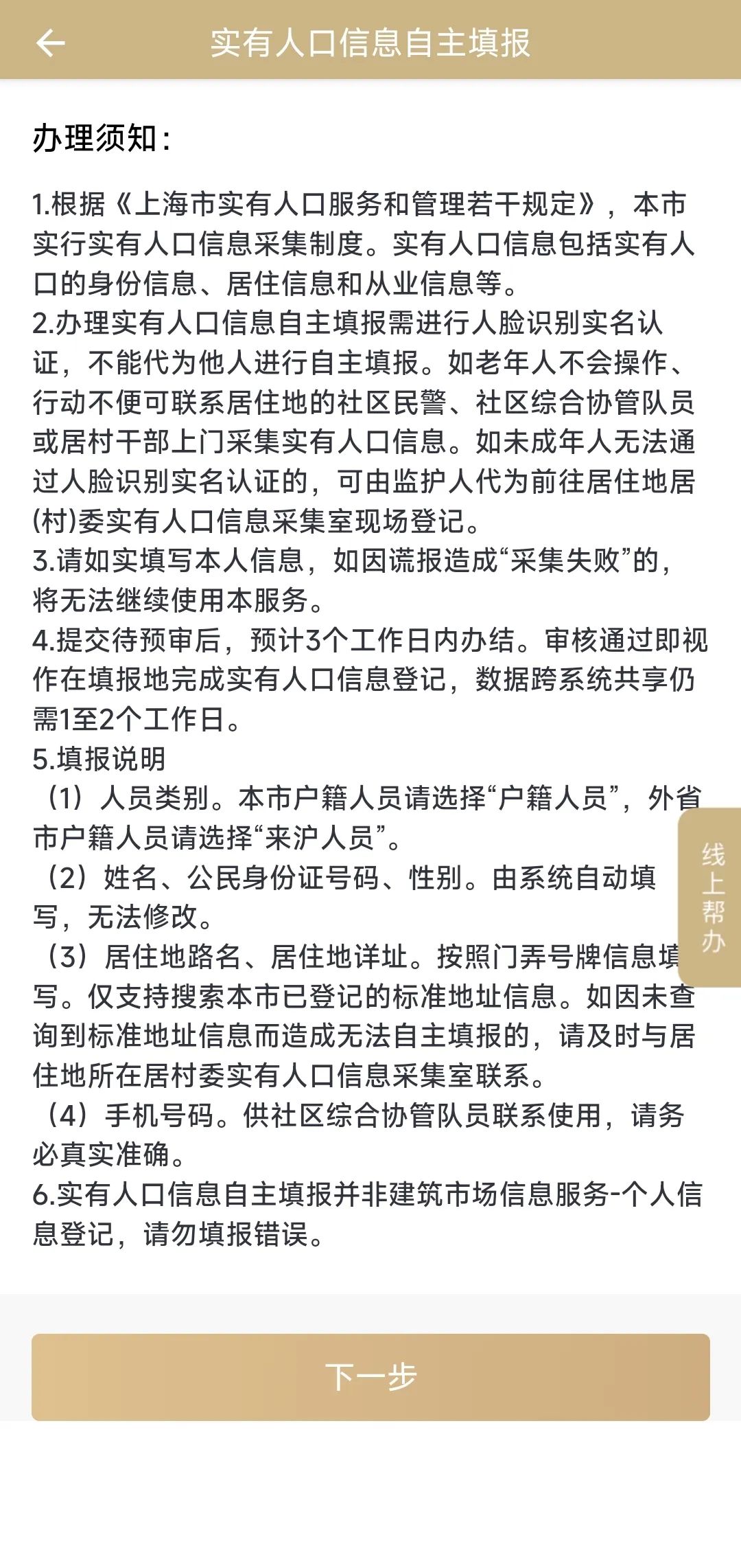第二步:點擊辦理事項第一項“實有人口自主填報”,仔細閱讀辦理須知后點擊“下一步”。