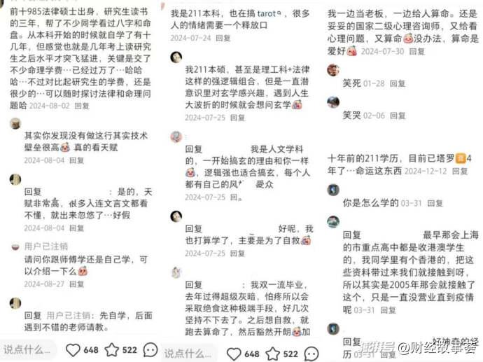 而小紅書玄學(xué)帖子下的評(píng)論,也能顯示許多玄學(xué)從業(yè)者及追隨者正是高知群體。