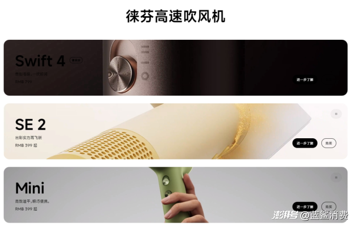 擺在徠芬面前的一個突出問題的是:“戴森平替”正在遭受“徠芬平替”的圍剿。GfK中怡康數(shù)據(jù)顯示,2024年前三季度,300元以下成為吹風(fēng)機(jī)線上主銷價格段,份額同比提升近11個百分點,銷售量增速達(dá)76.8%。但徠芬官網(wǎng)顯示,其大部分吹風(fēng)機(jī)價格在399元起,僅有兩款低于300元。曾經(jīng)靠“把3000元吹風(fēng)機(jī)做到599元”顛覆市場的徠芬,如今正被更低價位的“平替”產(chǎn)品沖擊。