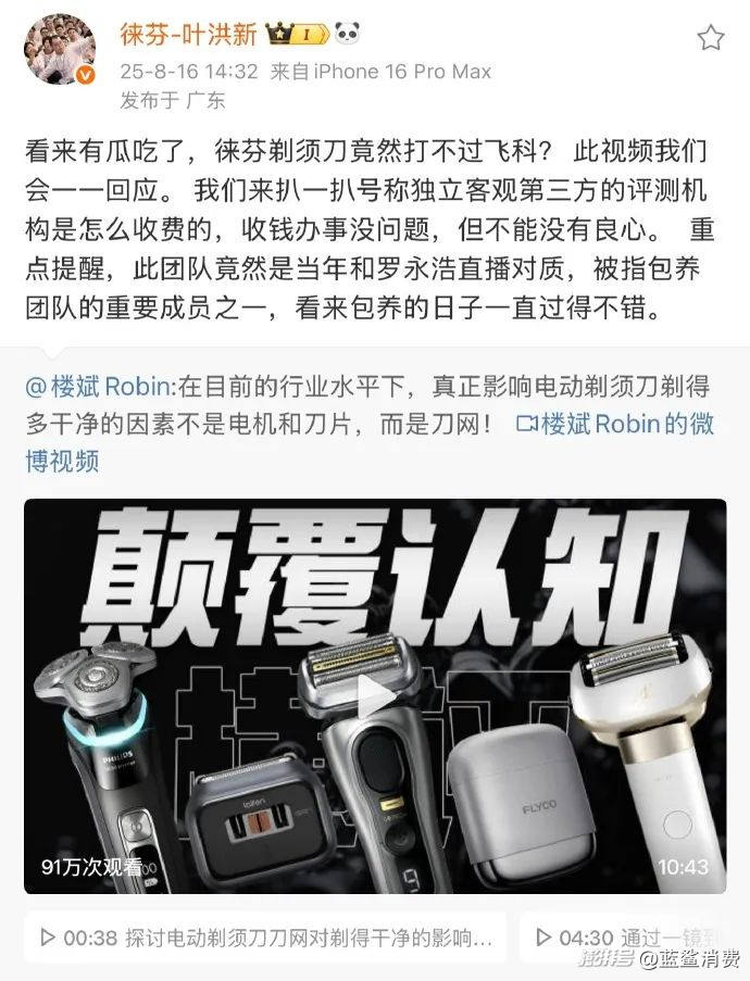 事件的起因是:徠芬前員工潘某的親弟弟(樓斌)運營的自媒體,發(fā)布了一期“徠芬和飛科對比測試”視頻,質(zhì)疑“徠芬剃須刀竟然打不過飛科”。這一內(nèi)容引發(fā)了徠芬創(chuàng)始人葉洪新的不滿,他認(rèn)為,號稱獨立客觀第三方的評測機(jī)構(gòu)“收錢辦事沒問題,但不能沒有良心?!?/p>