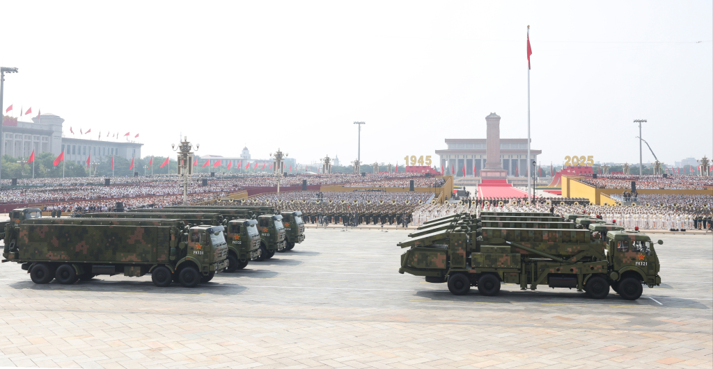 2025年9月3日,紀(jì)念中國(guó)人民抗日戰(zhàn)爭(zhēng)暨世界反法西斯戰(zhàn)爭(zhēng)勝利80周年大會(huì)在北京隆重舉行。這是對(duì)空抗擊方隊(duì)接受檢閱。 新華社記者 張玉薇 攝
