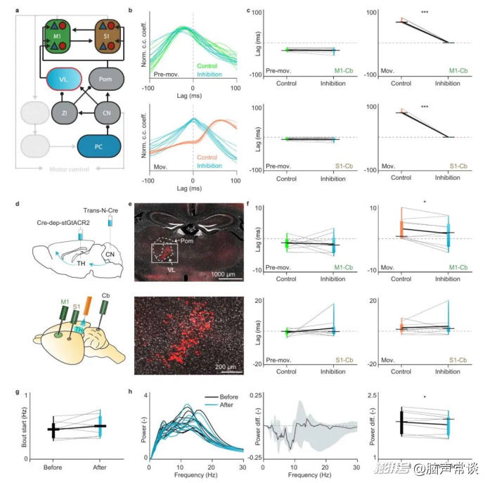 研究人員用光遺傳技術(shù)精準抑制小腦→VL的上行通路。結(jié)果發(fā)現(xiàn),抑制VL顯著干擾了運動階段小腦對M1的相位領(lǐng)先,但對運動前無影響,這與模型一致。同時,運動時的肌肉活動模式(功率譜)也發(fā)生改變,但沒有引發(fā)新的運動。