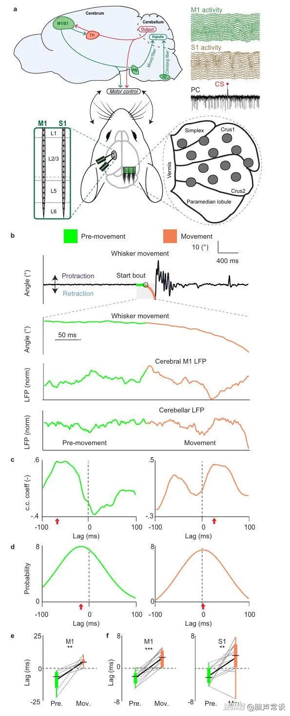 作者分析了12只小鼠運動皮層、體感皮層與小腦絨球區(qū)浦肯野細胞層之間的局部場電位相位關(guān)系。結(jié)果發(fā)現(xiàn),在運動開始后,原本運動前“大腦領(lǐng)先小腦”的相位模式,迅速轉(zhuǎn)變?yōu)椤靶∧X領(lǐng)先大腦”。體感皮層也呈現(xiàn)相似的轉(zhuǎn)變:運動前大腦主導(dǎo)。這表明,無論是運動還是體感皮層,其與小腦的協(xié)同模式都在運動瞬間發(fā)生了根本性切換從“大腦指揮”轉(zhuǎn)為“小腦引領(lǐng)”。這一動態(tài)變化與已知的胡須運動中信號從運動皮層傳向體感皮層、并在皮層內(nèi)由淺入深傳遞的方向一致。