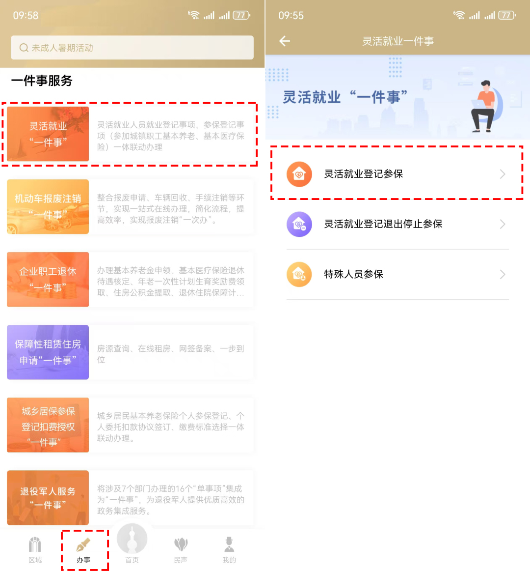 登錄“隨申辦市民云”APP→點擊首頁下方“辦事”菜單欄,點擊“靈活就業(yè)一件事”。(目前線上僅限本市戶籍、外省市戶籍靈活就業(yè)人員辦理)→選擇靈活就業(yè)登記參保。