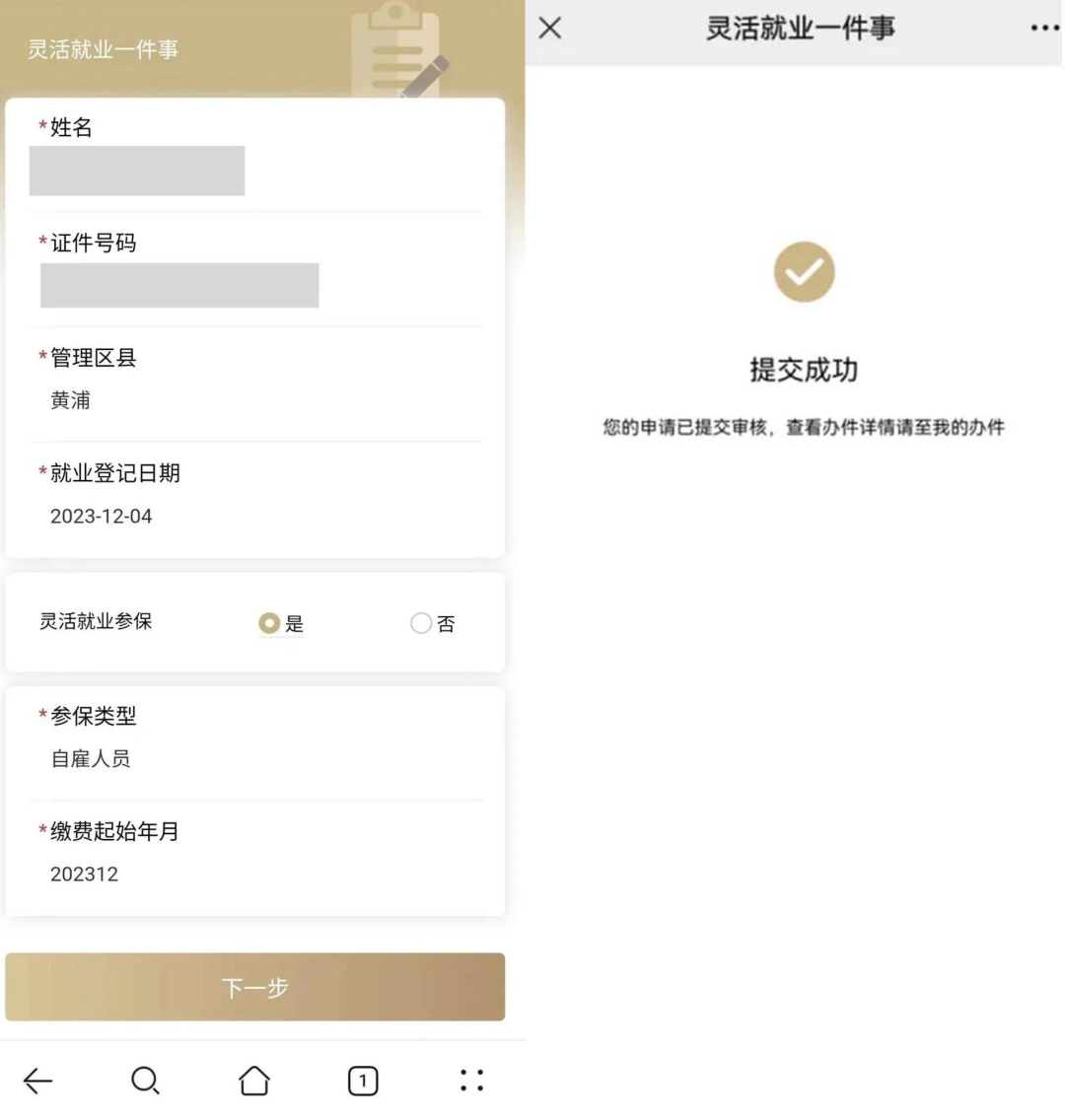 核對【姓名】【證件號碼】【就業(yè)登記日期】信息后,根據(jù)本人實際情況,選擇對應(yīng)【管理區(qū)縣】,并在【靈活就業(yè)參?!窟x項內(nèi)選擇【是】后,系統(tǒng)將自動生成繳費起始年月。點擊“下一步”→頁面提示以下信息,即表示已辦理成功。