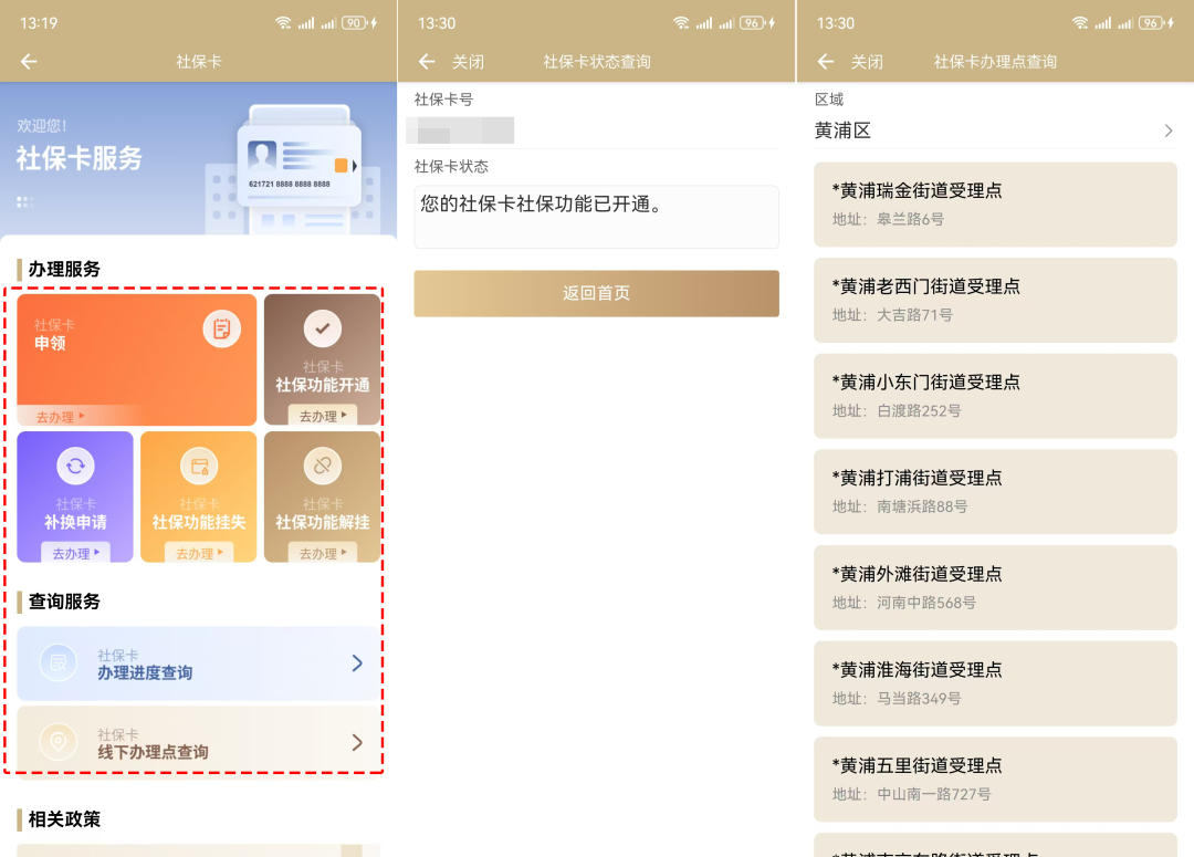 3、成功領(lǐng)取社保卡后,在“社保卡服務(wù)”頁面選擇“社保功能開通”,足不出戶即可開通社保功能。還可進(jìn)行社保功能掛失、解掛、補換、查詢線下辦理點、辦件進(jìn)度等操作哦~