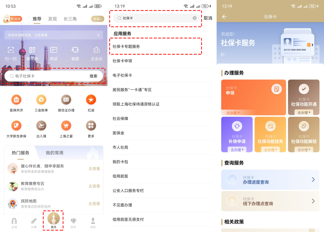 1、登錄“隨申辦市民云”APP→首頁搜索框中輸入關(guān)鍵字“社??ā薄c擊“社??▽n}服務(wù)”進(jìn)入辦理頁面;