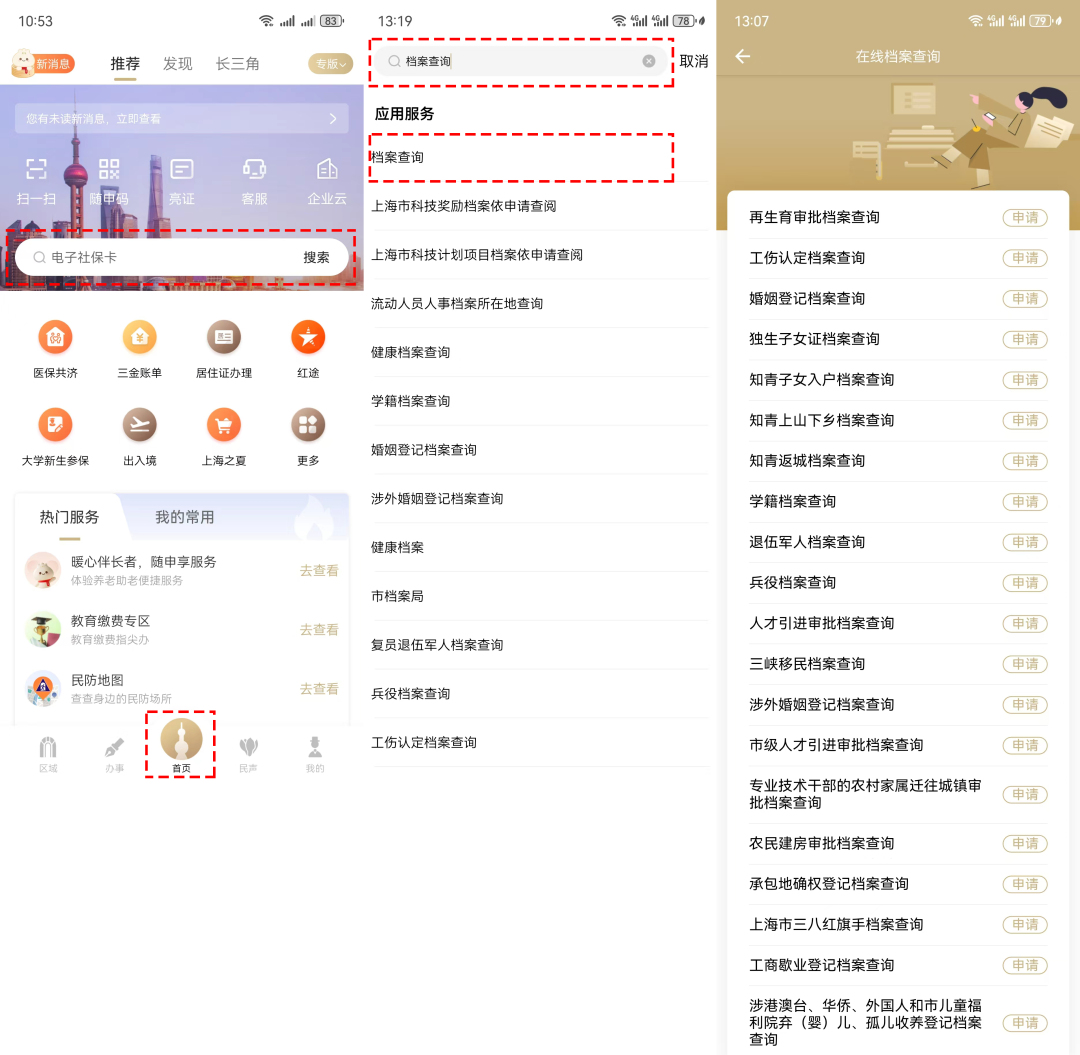登錄“隨申辦市民云”APP→首頁搜索框中輸入關(guān)鍵字“檔案查詢”并點擊進(jìn)入后,即可在線查詢?nèi)纾骸氨蹤n案”“涉外婚姻登記檔案”“工傷認(rèn)定檔案”“獨生子女檔案”等多類檔案。
