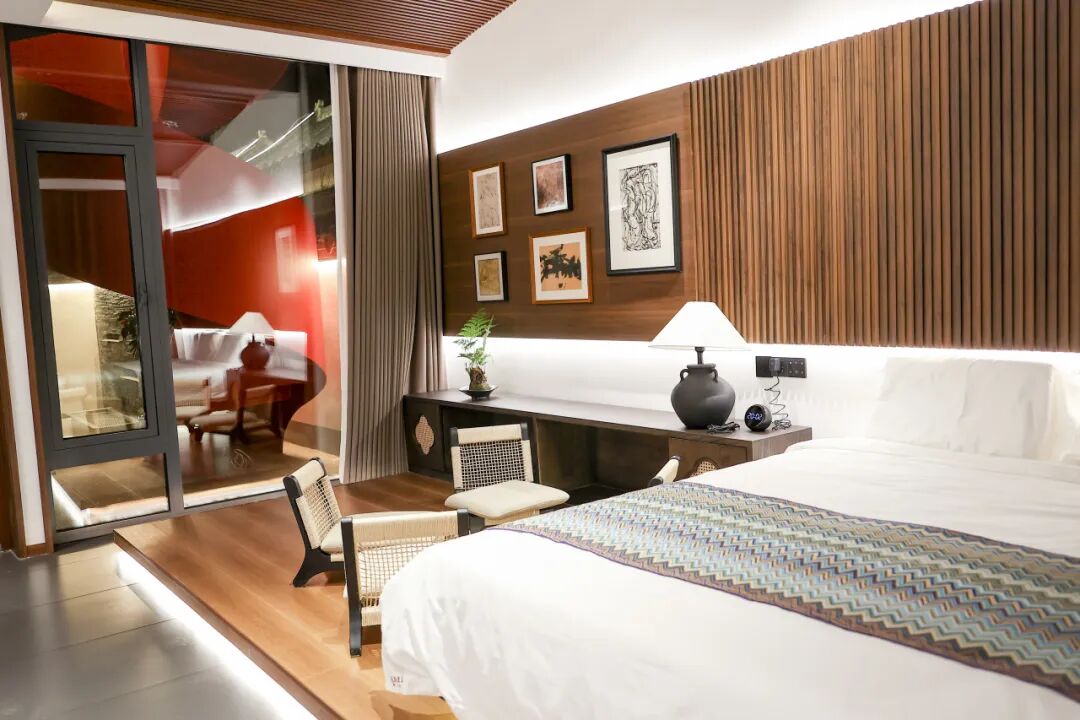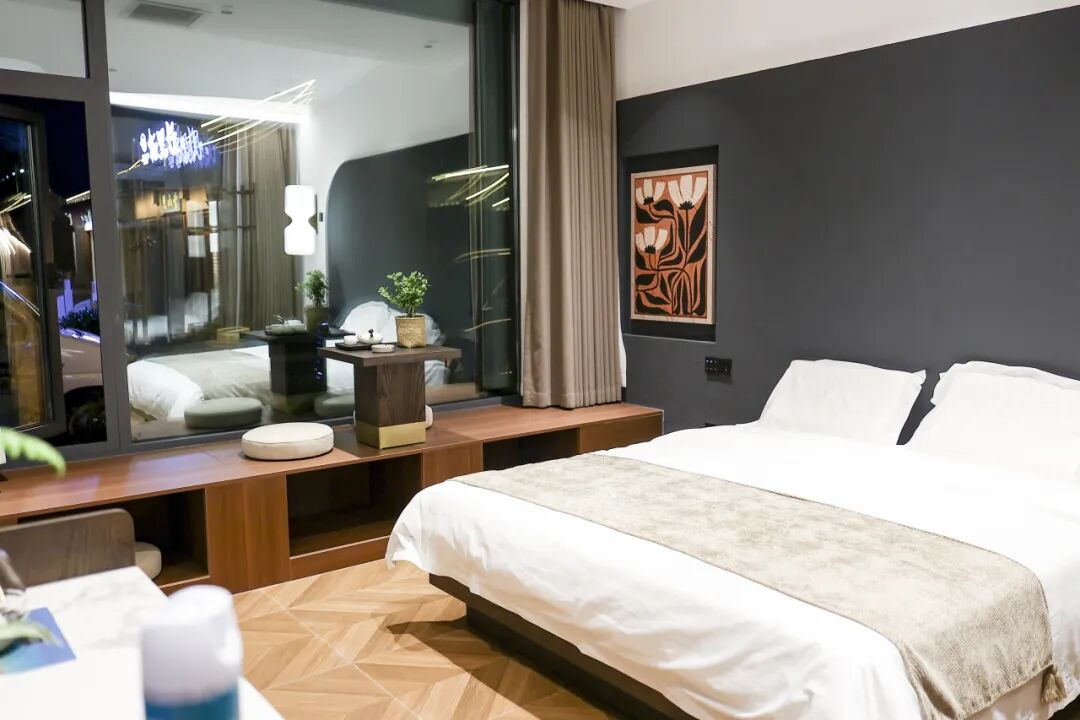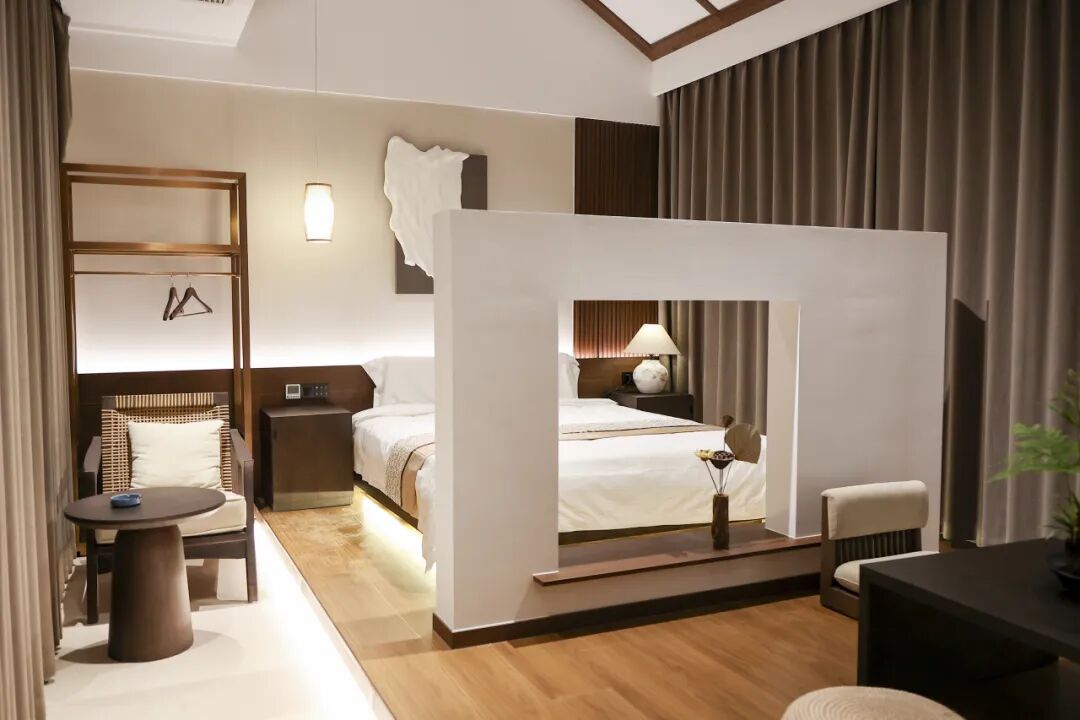 18間套房是民宿寫給賓客的 “私密情書”,推開門便撞進一片“私享天地”??头坷餂]有繁復(fù)的裝飾,只以簡潔素樸的格調(diào)襯著窗外的綠意,放一池溫泉水,任暖意漫過四肢,耳邊是遠處隱約的蟲鳴,所謂“聽泉而眠”,大抵就是這般模樣。