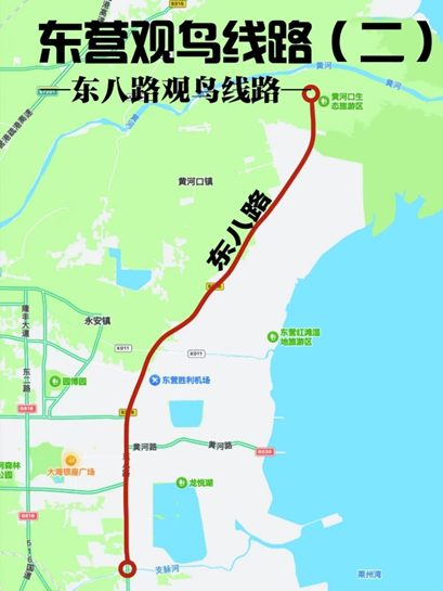 該線路自永紅路與東八路交叉口向東,經(jīng)過機(jī)場東濕地,沿濱海大道北上,途經(jīng)小島河碼頭、濱海濕地、黃河大壩,最終抵達(dá)黃河口生態(tài)旅游區(qū)。
