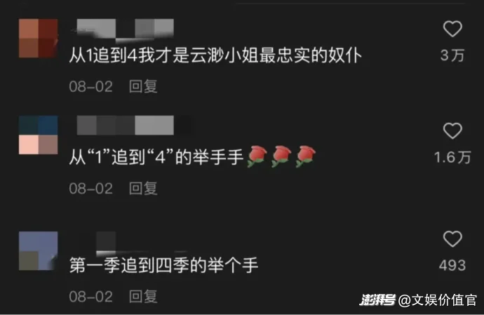 系列化IP允許制作方通過多季的布局,逐步鋪陳宏大的世界觀,細致刻畫人物的成長弧光,在保留短劇情緒拉滿、節(jié)奏飛起優(yōu)點的同時,又能深挖故事深度,留足回味空間。在此基礎(chǔ)上,系列化短劇正在改變制作方與用戶的關(guān)系,將單向的內(nèi)容消費轉(zhuǎn)變?yōu)殡p向的情感連接。當用戶追看一個系列至三季、四季時,角色和故事便融入其生活軌跡?!对泼臁废盗械挠^眾評論“從1追到4,我才是云渺小姐最忠實的奴仆”,正是這種深度情感綁定的生動體現(xiàn)。對于制作方而言,這意味著一批核心粉絲的沉淀,是所有IP衍生開發(fā)的基本盤。