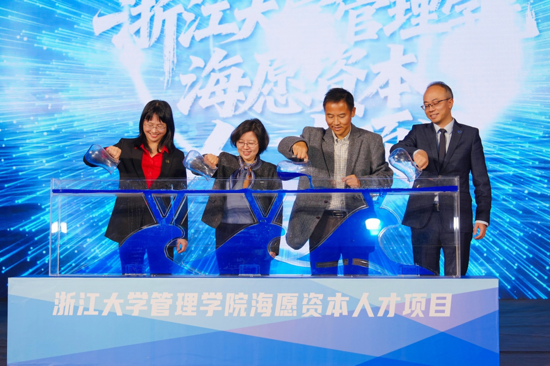 浙江大學(xué)管理學(xué)院海愿資本人才項目啟動儀式(左起:浙大管院黨委書記許翾,浙大發(fā)展聯(lián)絡(luò)辦公室主任劉崢嶸,海愿創(chuàng)業(yè)投資董事長、深圳校友會會長陳軍,浙大管院院長謝小云)