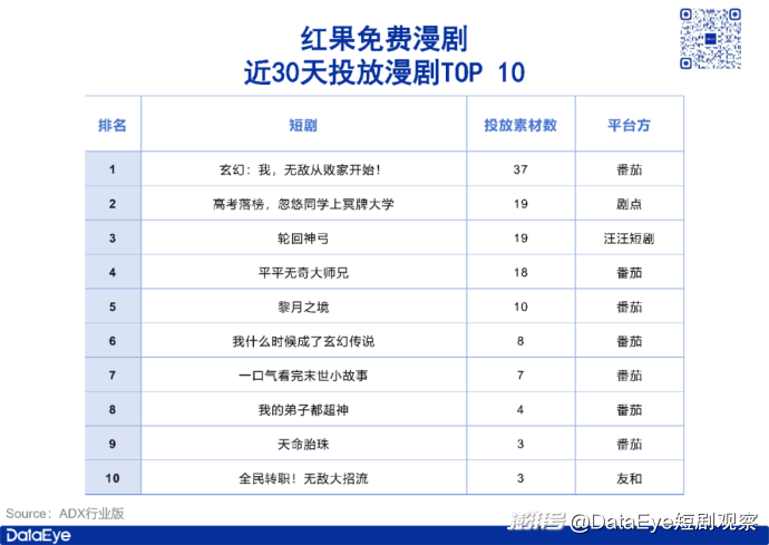 在主投劇集上,ADX行業(yè)版數(shù)據(jù)顯示,近30天紅果免費(fèi)漫劇所投劇集以玄幻、修仙類為主,其中《玄幻:我,無敵從敗家開始!》位列第一,投放素材量37組。