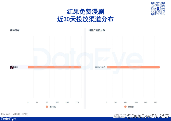 在渠道分布上,ADX行業(yè)版數(shù)據(jù)顯示,紅果免費(fèi)漫劇近30天僅在抖音平臺進(jìn)行了廣告投放,且值得注意的是,廣告位僅有“搜索廣告位”。