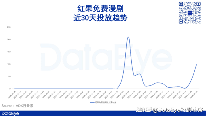 ADX行業(yè)版數(shù)據(jù)顯示,自11月3日起,紅果免費(fèi)漫劇便開始投放,并在11月4日達(dá)最高峰,日投放素材量210組,而后迅速下滑,日投放素材量跌至個位數(shù),11月15日開始再度加大投放力度,至16日,日投放素材量近100組。