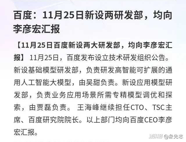 2025年11月25日,百度一則技術研發(fā)架構調整公告,揭開了公司AI戰(zhàn)略的深層變革:新設的基礎模型研發(fā)部與應用模型研發(fā)部直接向CEO李彥宏匯報,身為集團CTO的王海峰被排除在本次大模型核心研發(fā)管理之外,權力顯著收縮。這一調整的背后,是李彥宏對百度AI業(yè)務“技術有積累、市場無響動”的不滿,而作為技術體系最高負責人,王海峰自然難辭其咎。