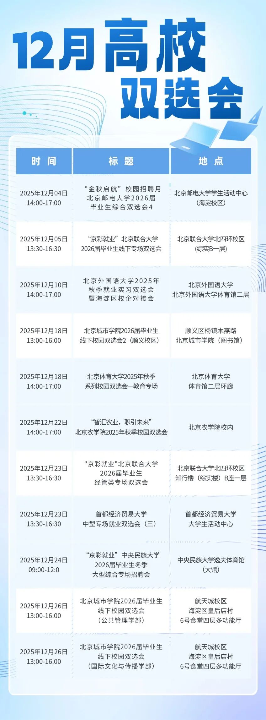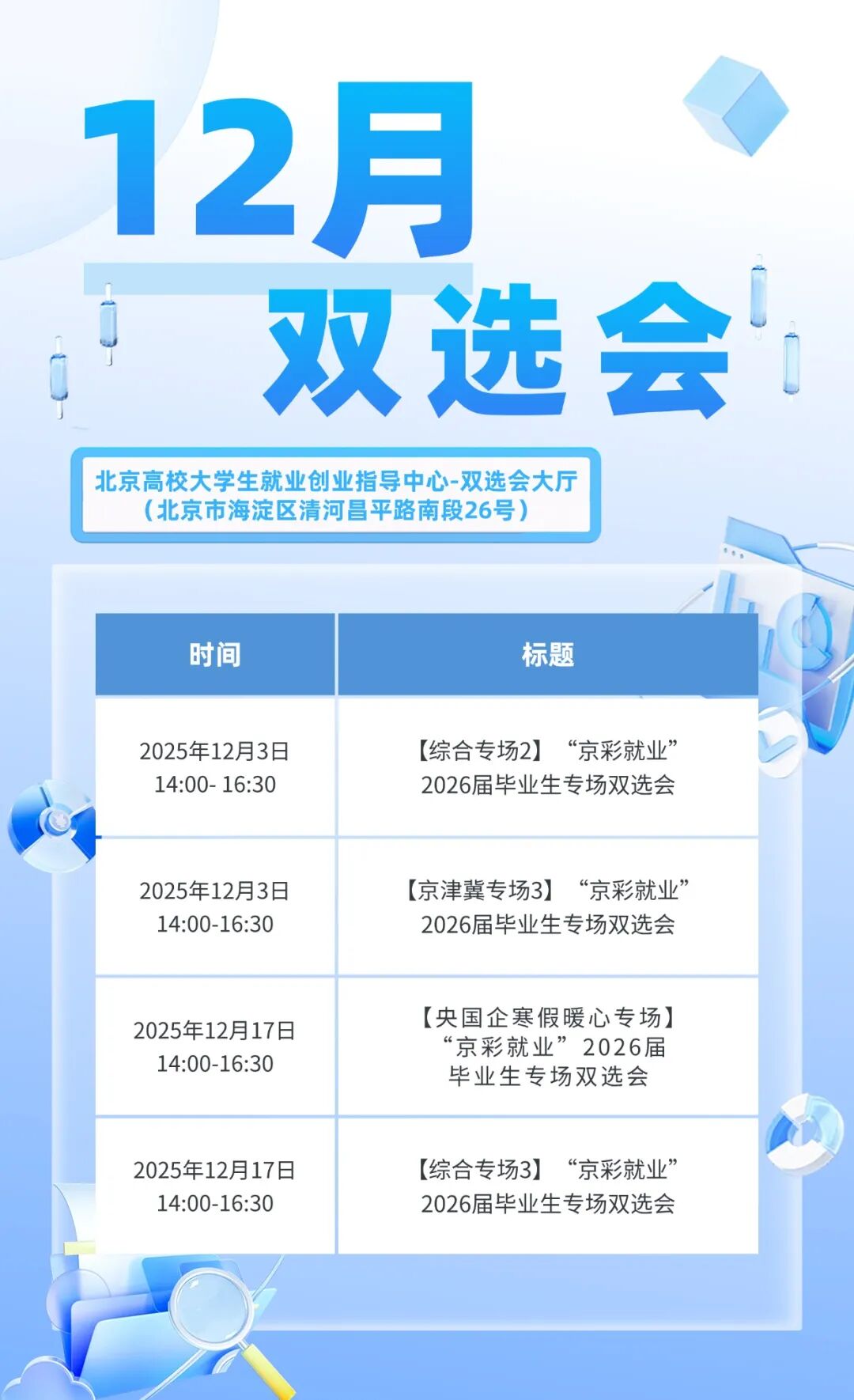更多雙選會持續(xù)增加中,請您關(guān)注“成功就業(yè)”微信公眾號和“北京高校大學(xué)生就業(yè)創(chuàng)業(yè)信息網(wǎng)”,及時獲取最新信息。雙選會場次安排請以系統(tǒng)內(nèi)顯示為準(zhǔn)。