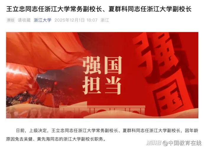 據浙江大學官方微信,日前,上級決定,王立忠同志任浙江大學常務副校長、夏群科同志任浙江大學副校長,因年齡原因免去吳健、黃先海同志的浙江大學副校長職務。