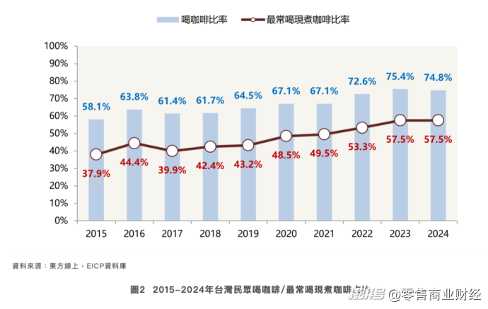 同時(shí),2024年中國(guó)臺(tái)灣13-64歲的消費(fèi)者中,喝咖啡比率達(dá)到74.8%;最常喝“現(xiàn)煮咖啡”的比例也占到總?cè)丝诘?7.5%。顯然,咖啡已經(jīng)變成了當(dāng)?shù)叵M(fèi)者最日常的飲品之一,并滲透進(jìn)年輕學(xué)生、白領(lǐng)及中老年人等各年齡段人群的日常生活中。