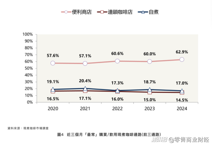 數(shù)據(jù)顯示,2024年,97.2%的消費(fèi)者過(guò)去三個(gè)月曾在便利店(如統(tǒng)一超商的CITY CAFE、全家的Let's Café等)購(gòu)買(mǎi)現(xiàn)煮咖啡;消費(fèi)者最常購(gòu)買(mǎi)/飲用的渠道也是以便利商店為首,占比達(dá)到62.9%。