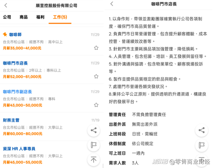目前,該網(wǎng)傳選址門(mén)店已張貼瑞幸經(jīng)典藍(lán)白色調(diào)的招聘海報(bào),海報(bào)附帶的二維碼指向代理公司順昱控股在臺(tái)灣招聘網(wǎng)站的官方招募頁(yè)面。公開(kāi)招聘信息顯示,順昱控股正為臺(tái)灣市場(chǎng)招募咖啡師、店長(zhǎng)、副店長(zhǎng)、財(cái)務(wù)主管及資深HR人事專(zhuān)員等核心崗位。