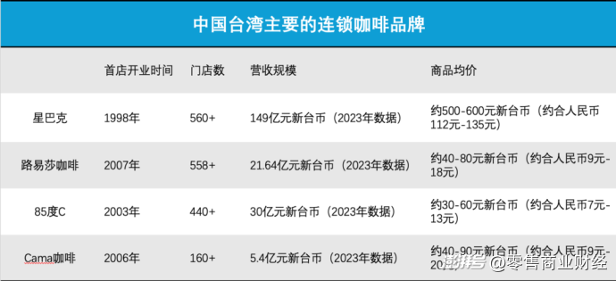 其中,星巴克作為最早進(jìn)入中國(guó)臺(tái)灣的國(guó)際咖啡品牌,1998年便在臺(tái)北開(kāi)設(shè)首店,截至目前門(mén)店數(shù)已超560家,2023年總營(yíng)收達(dá)149億元新臺(tái)幣,憑借品牌溢價(jià)與“第三空間”體驗(yàn),牢牢占據(jù)高端市場(chǎng)。