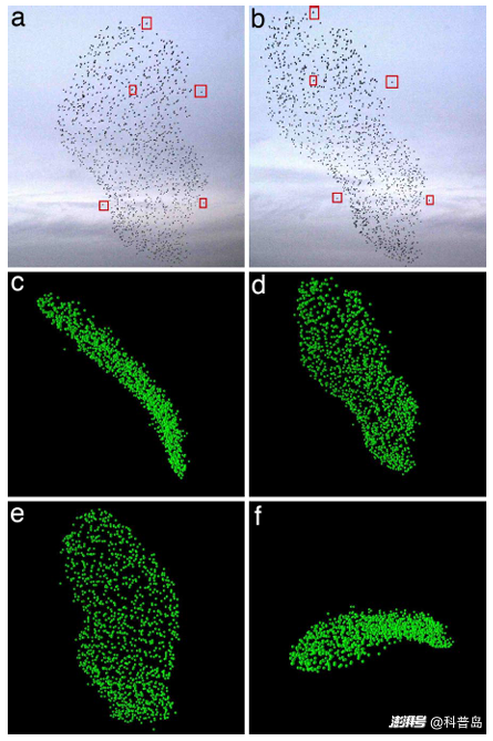 2005年至2006年間,來自意大利的統(tǒng)計物理學(xué)家帕里西帶領(lǐng)著學(xué)生們,與兩位鳥類學(xué)家一起,對羅馬火車站前飛舞的椋鳥群進(jìn)行了觀測和記錄。他們從多個角度同時拍攝椋鳥的運(yùn)動過程,并將它們重建成3D圖像。
