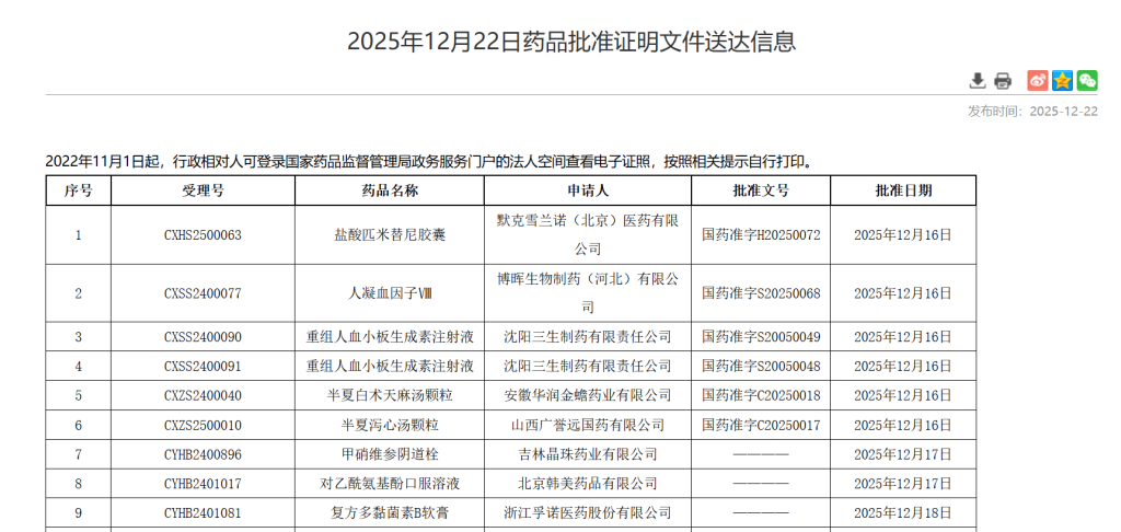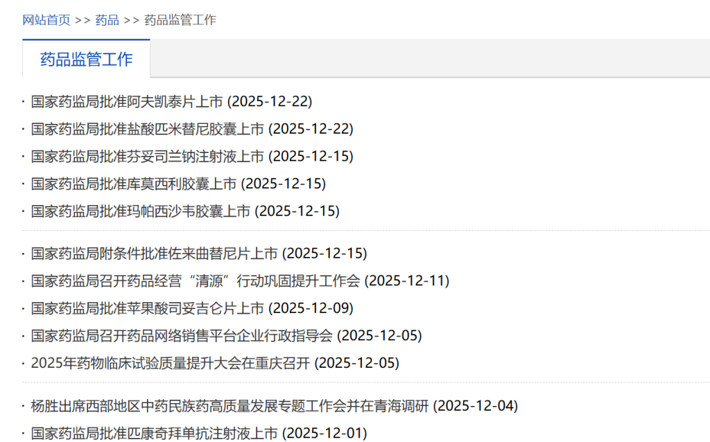 進(jìn)入12月,國(guó)家藥監(jiān)局政務(wù)服務(wù)門戶網(wǎng)站也多次公布了藥品批準(zhǔn)證明文件送達(dá)信息,僅2025年12月22日的藥品批準(zhǔn)證明文件送達(dá)信息就涉及180個(gè)受理號(hào)。國(guó)家藥監(jiān)局在“藥品監(jiān)管工作”也發(fā)布了8條新藥上市的消息。
