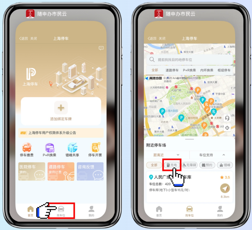在“上海停車”專欄中,點擊下方的“找車位”選項,跳轉(zhuǎn)至相應(yīng)頁面后,選擇“車位支持”功能中的“充電”選項。