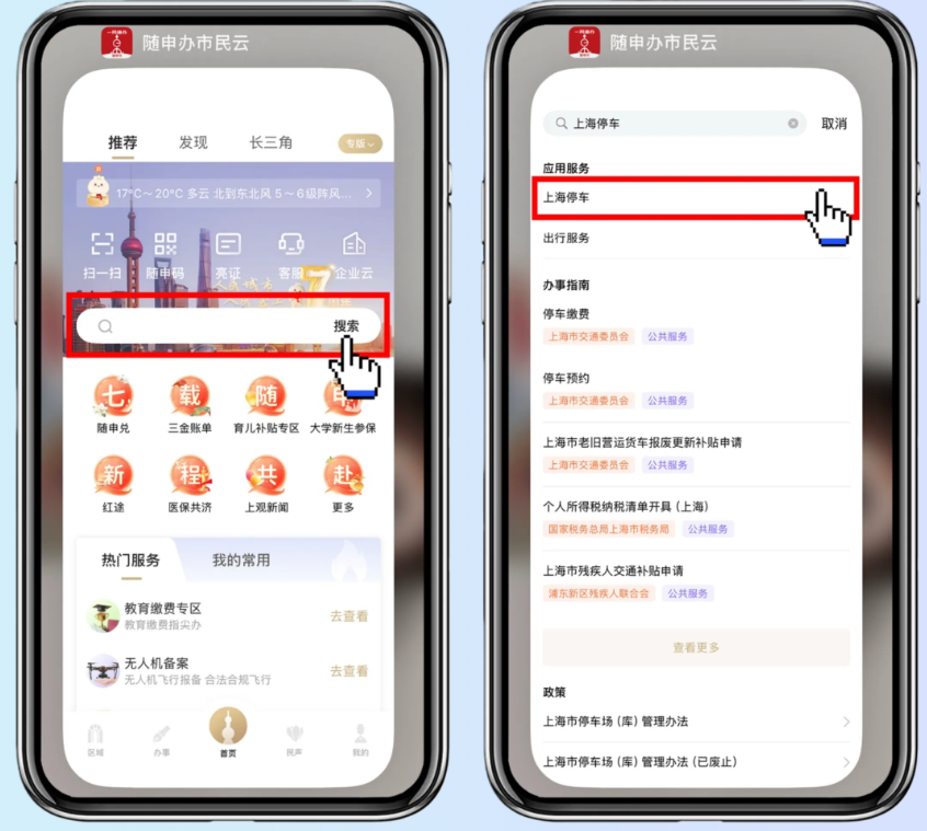 打開“隨申辦市民云”APP,首頁搜索欄輸入“上海停車”,并點擊進(jìn)入。
