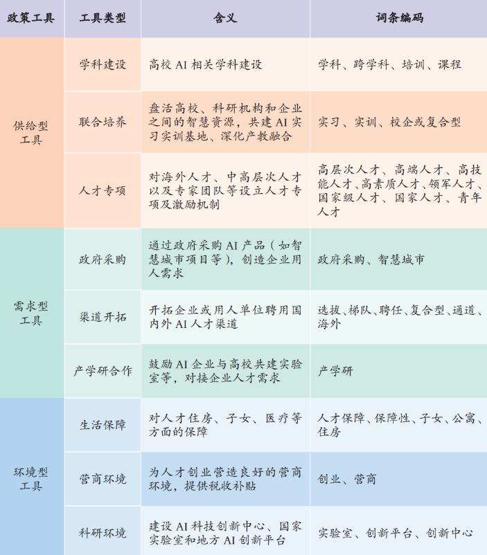 表1 AI人才政策工具及具體含義