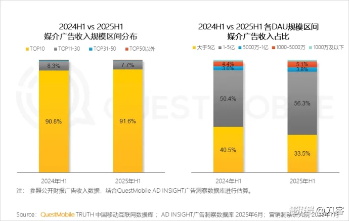 QuestMobile 的數(shù)據(jù)顯示,2025年上半年,前十大互聯(lián)網(wǎng)平臺吃走了 91.6% 的媒介廣告收入,比2024年同期還漲了0.8個百分點。