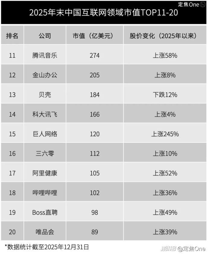 在前十大互聯(lián)網(wǎng)巨頭格局基本穩(wěn)固的背景下,市值排名第11至第20位的公司,構(gòu)成了中國(guó)互聯(lián)網(wǎng)最具彈性的中腰部陣營(yíng),在過(guò)去一年展現(xiàn)出強(qiáng)烈的股價(jià)漲幅,反映出市場(chǎng)對(duì)其細(xì)分賽道潛力的認(rèn)可。