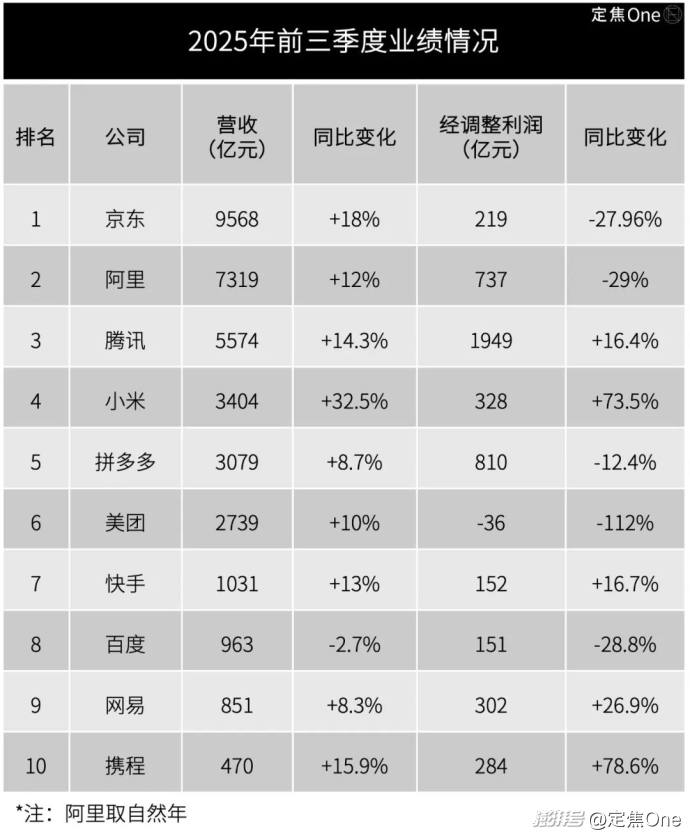 從前十大公司財(cái)報(bào)看,營(yíng)收端僅百度出現(xiàn)小幅下滑,其余九家均實(shí)現(xiàn)正增長(zhǎng);若以增速論潛力,小米以32.5%的營(yíng)收增幅領(lǐng)跑。然而,在利潤(rùn)表現(xiàn)上,情況則顯得復(fù)雜得多。