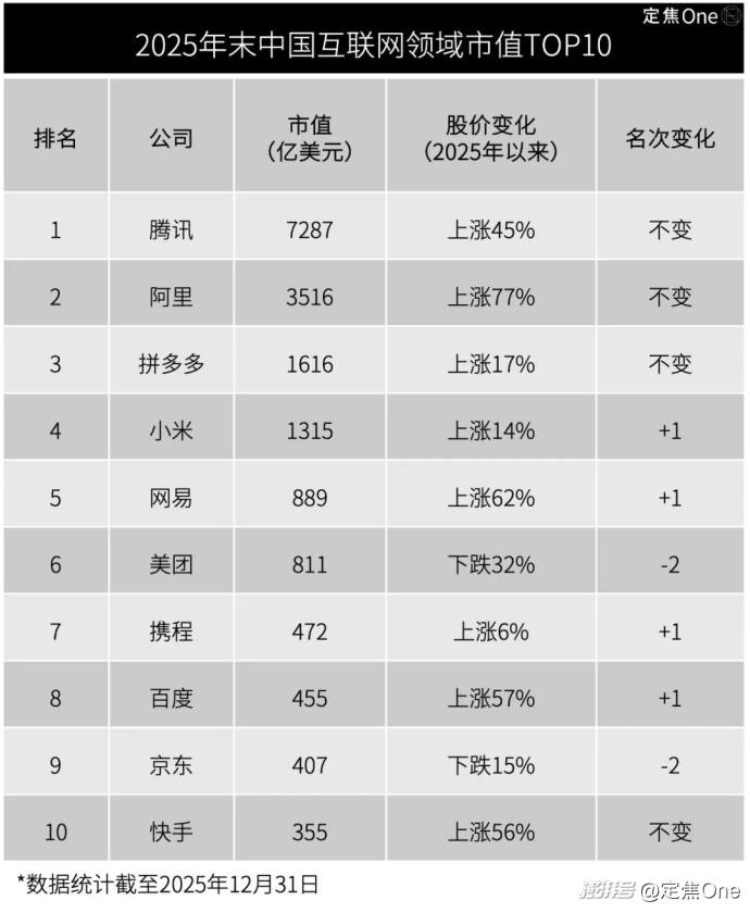 整體來(lái)看,2025年中國(guó)互聯(lián)網(wǎng)市值前十的玩家陣營(yíng)保持穩(wěn)定,但內(nèi)部位次更迭頗為明顯。其中美團(tuán)與京東因行業(yè)競(jìng)爭(zhēng)加劇,市值與股價(jià)受到影響,而阿里、網(wǎng)易、百度、快手等公司,則在不同維度上獲得了市場(chǎng)的重估。
