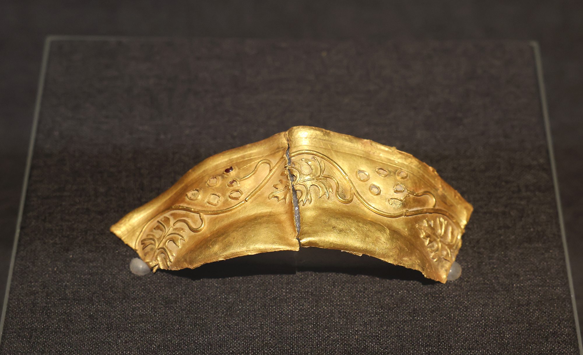 博格達(dá)沁古城出土葡萄紋金器 本網(wǎng)記者 朱高磊/攝