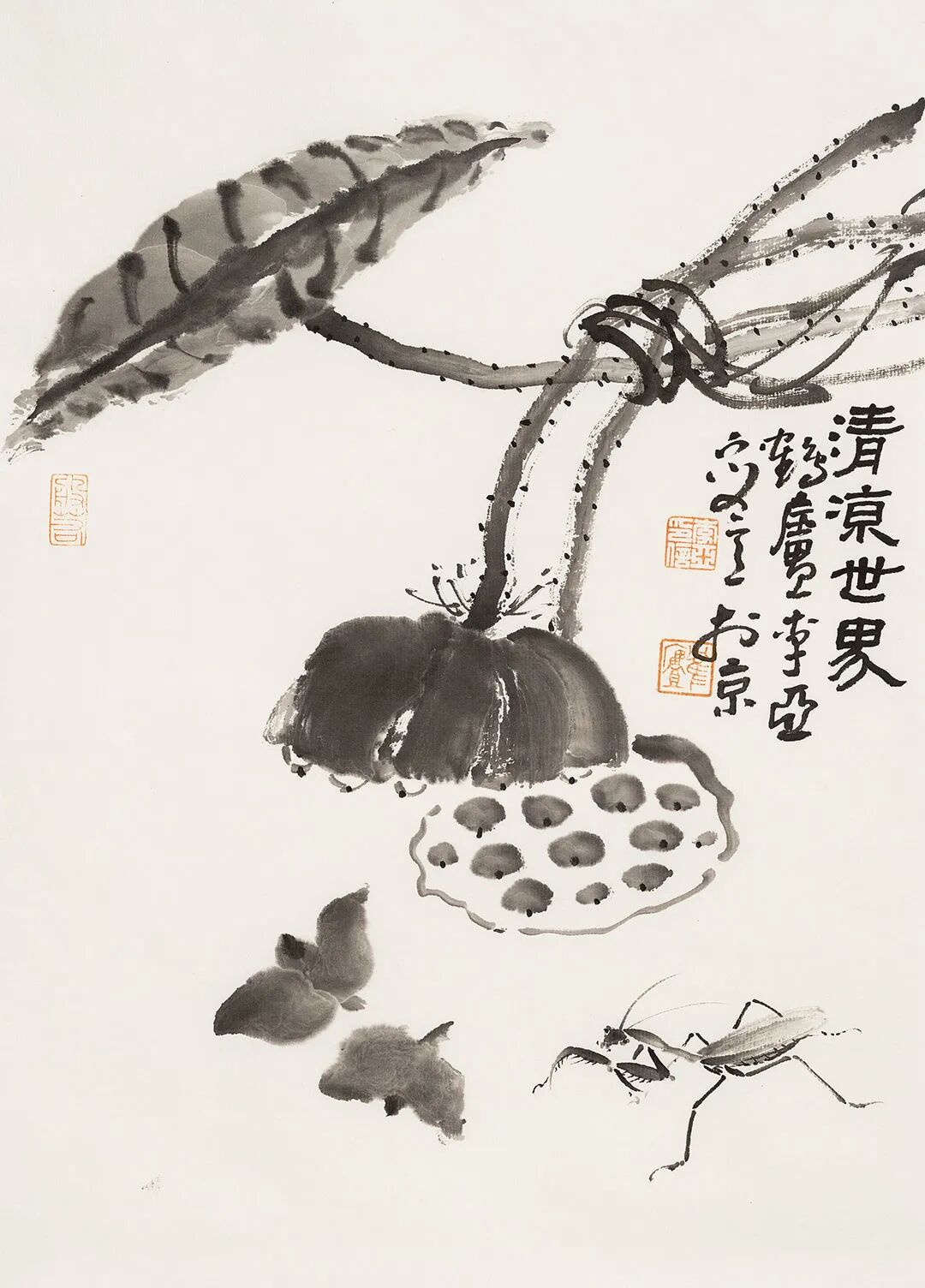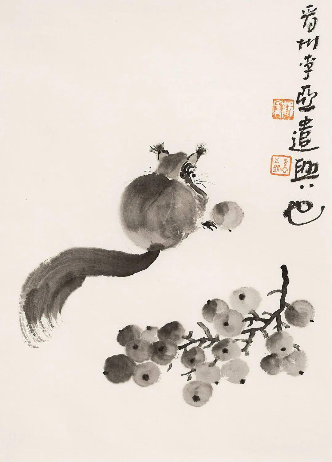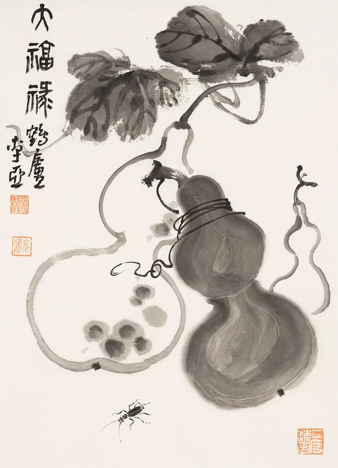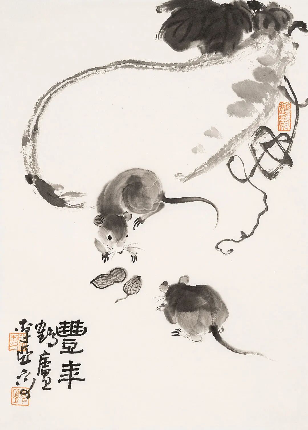 他畫石如觀山,其勢蜿蜒,若藏云氣;畫蘭伴靈芝,題“與善人居”,言簡意深,道出君子之交的溫潤;畫雀立菊下,靜默無言,卻似有秋聲入耳;畫魚游空際,鱗紋未盡,已覺水光浮動。松梅相映,是歲寒之志;鼠戲瓜藤,是豐年之趣;狐疑之態(tài),是童心未泯;葫蘆纏繞,是福祿綿長。