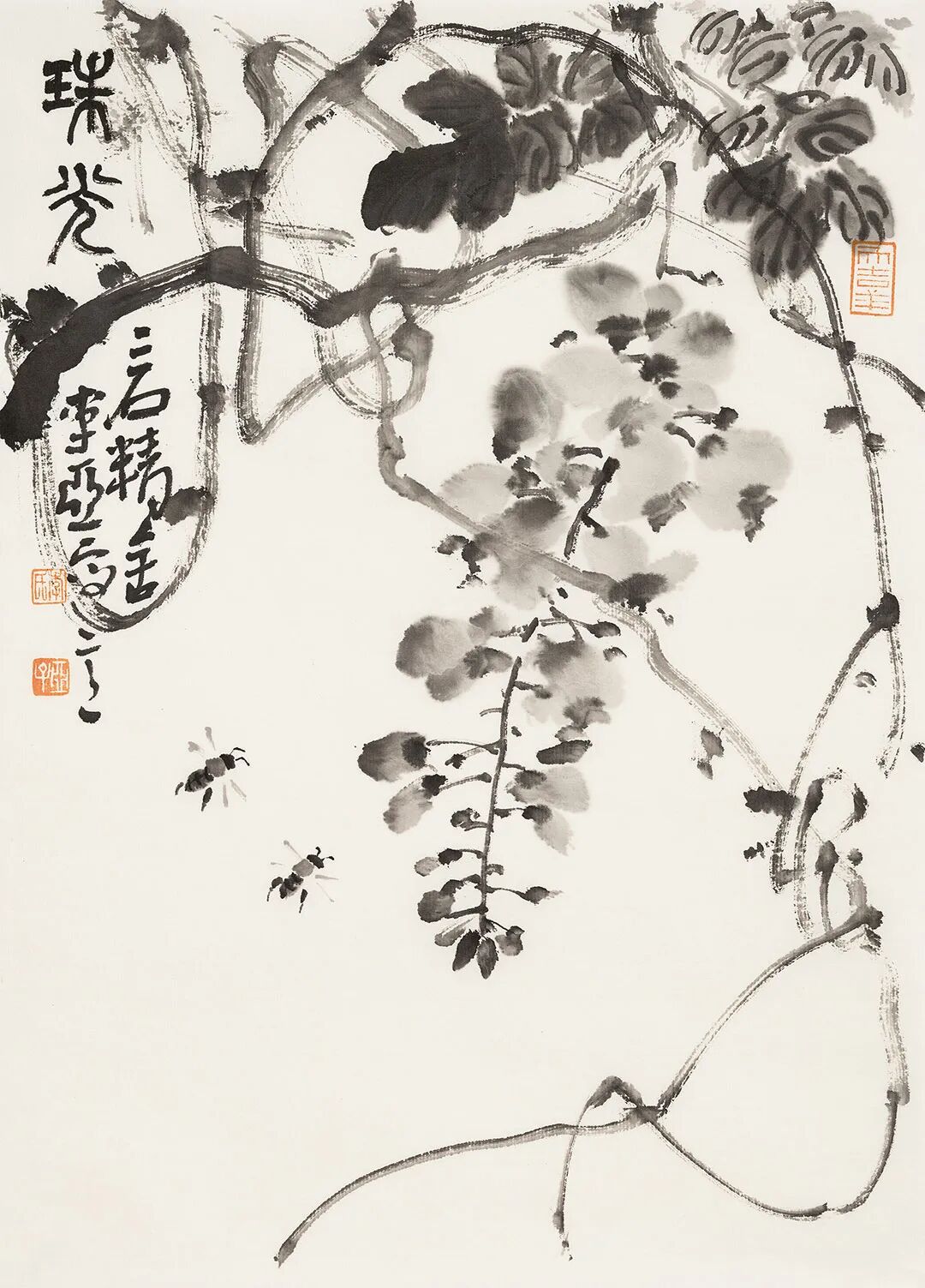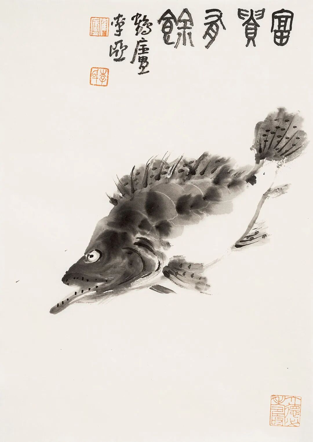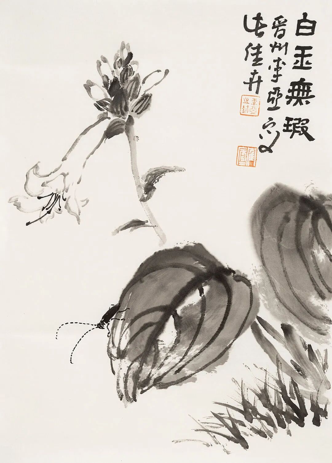 他畫石如觀山,其勢蜿蜒,若藏云氣;畫蘭伴靈芝,題“與善人居”,言簡意深,道出君子之交的溫潤;畫雀立菊下,靜默無言,卻似有秋聲入耳;畫魚游空際,鱗紋未盡,已覺水光浮動。松梅相映,是歲寒之志;鼠戲瓜藤,是豐年之趣;狐疑之態(tài),是童心未泯;葫蘆纏繞,是福祿綿長。