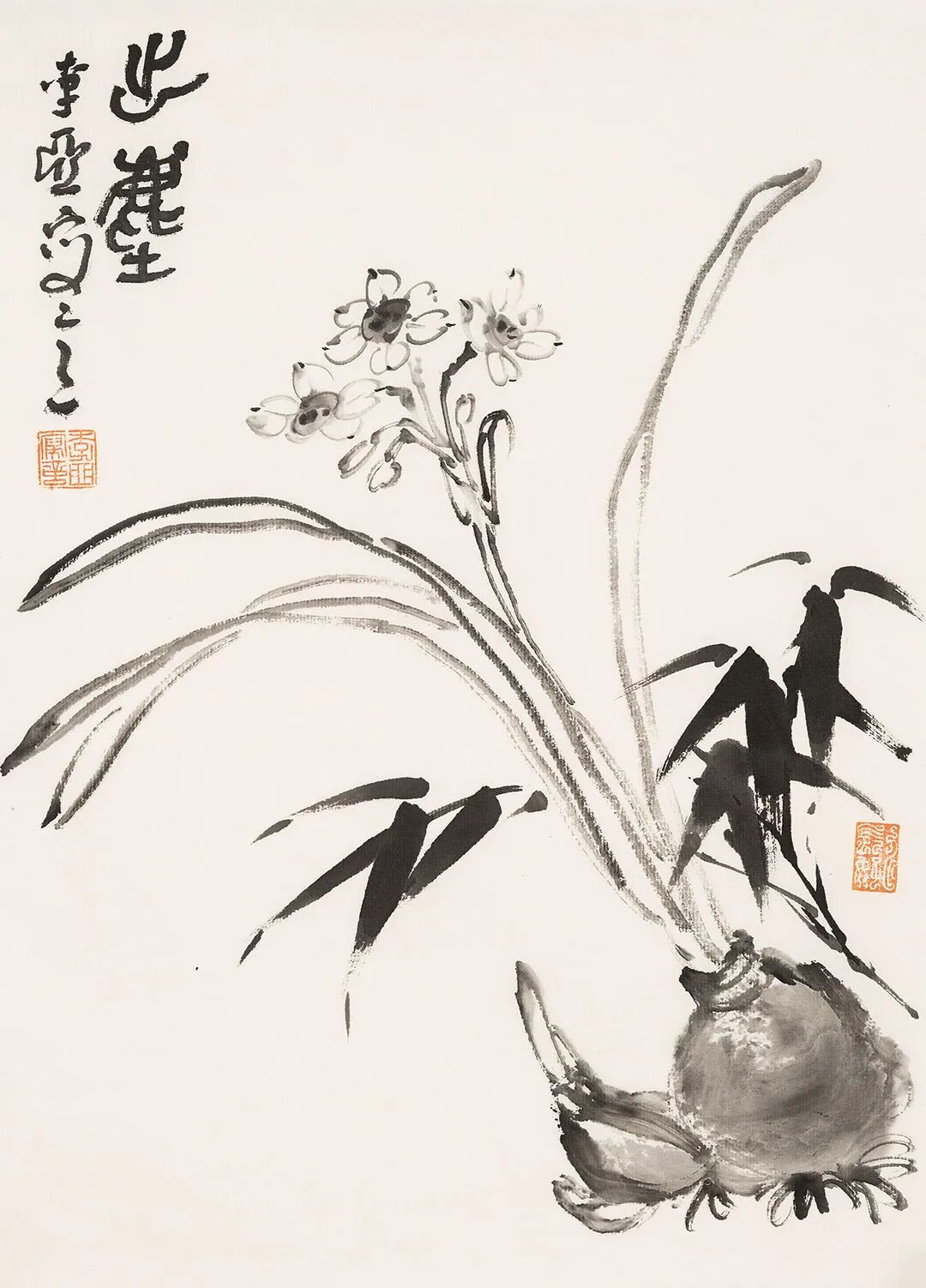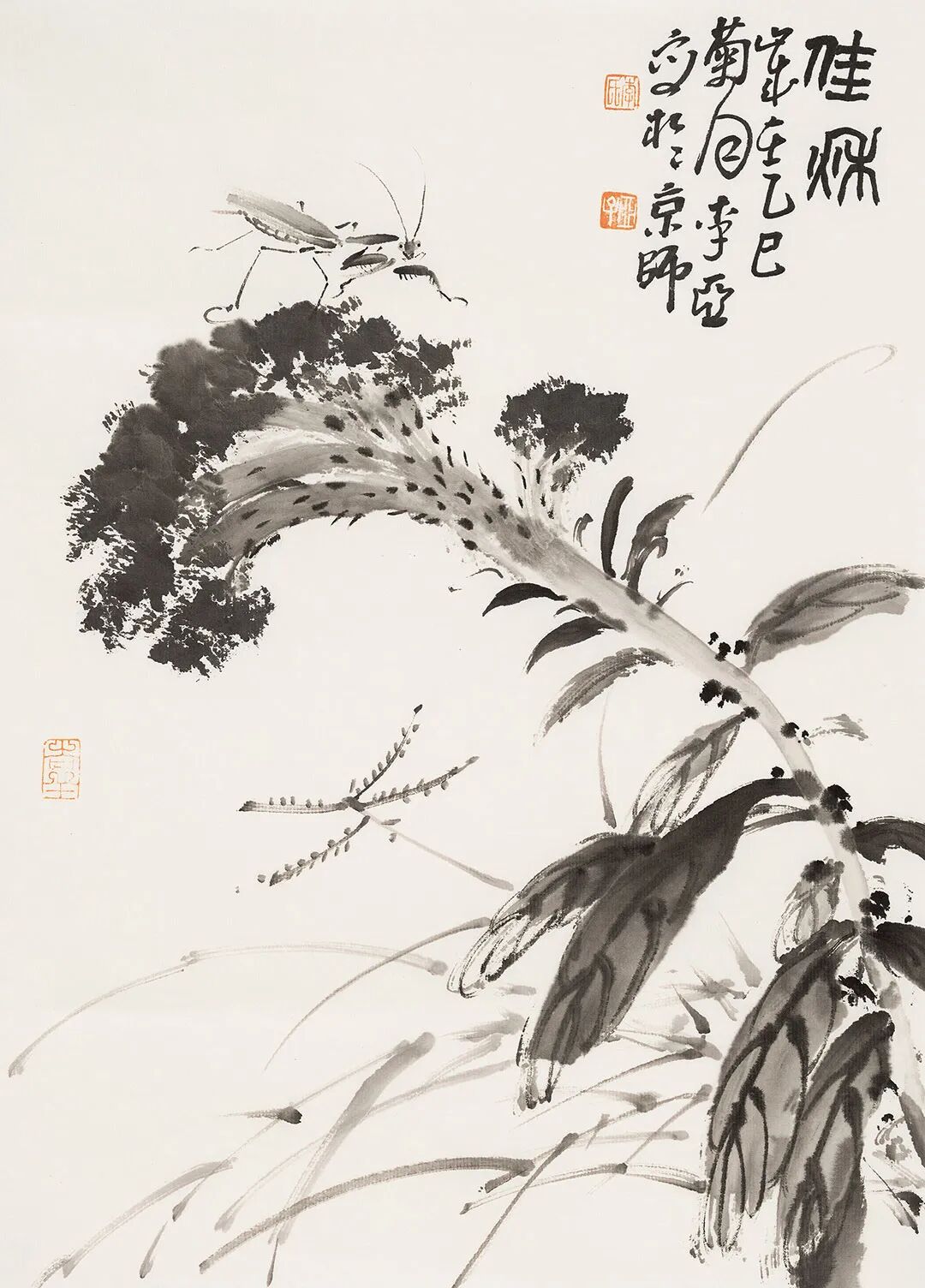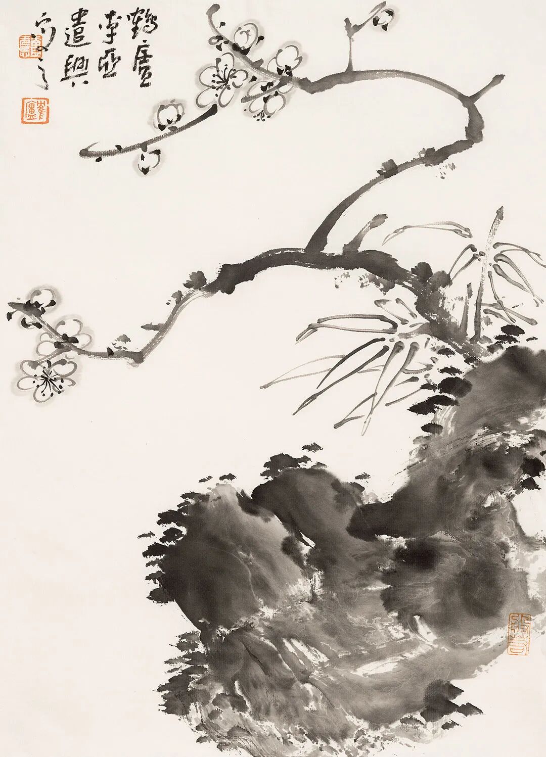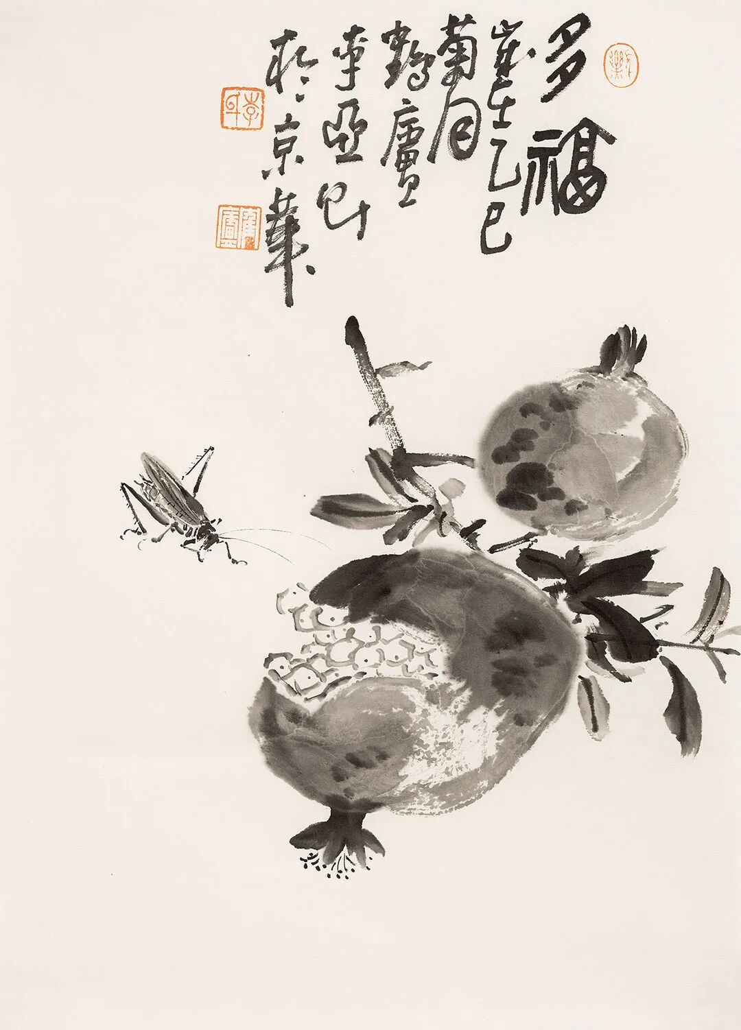 他畫石如觀山,其勢蜿蜒,若藏云氣;畫蘭伴靈芝,題“與善人居”,言簡意深,道出君子之交的溫潤;畫雀立菊下,靜默無言,卻似有秋聲入耳;畫魚游空際,鱗紋未盡,已覺水光浮動。松梅相映,是歲寒之志;鼠戲瓜藤,是豐年之趣;狐疑之態(tài),是童心未泯;葫蘆纏繞,是福祿綿長。