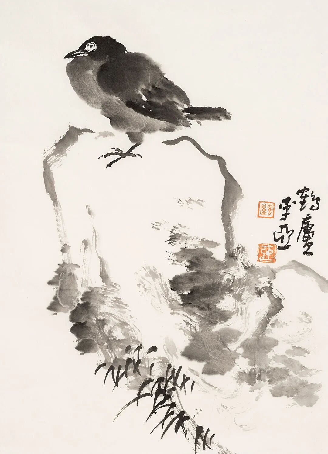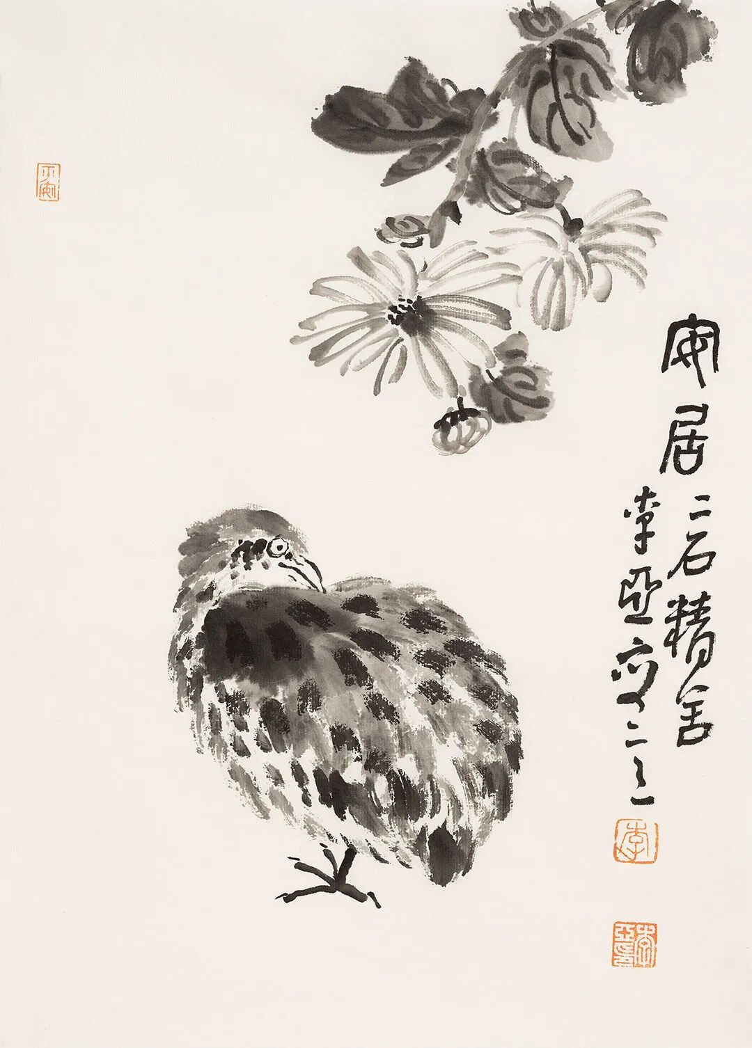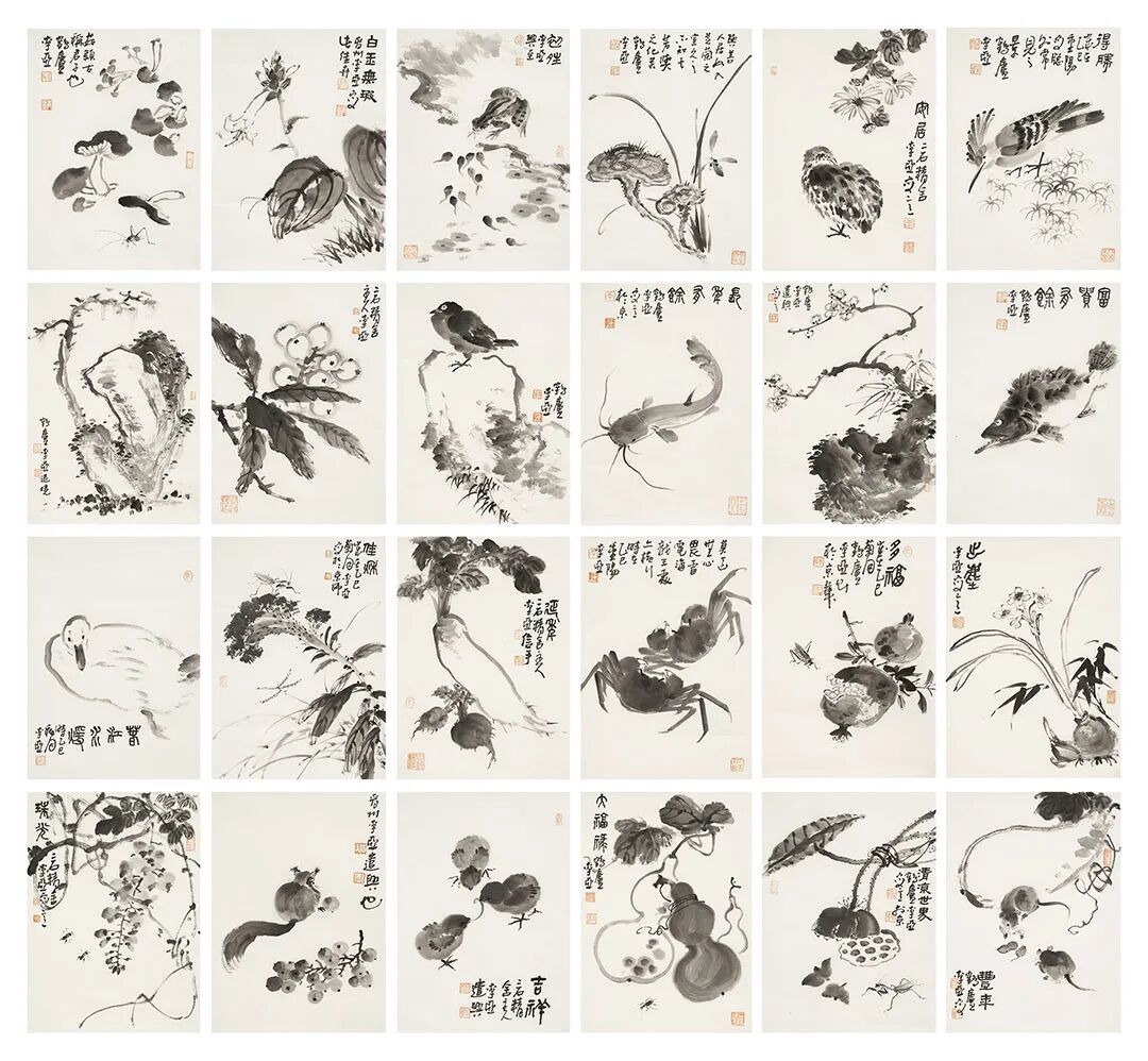 李亞新這組二十四開水墨冊頁,不以形勝,而以意通。筆墨間無喧囂之色,卻自有天地呼吸。他將日常物象——石、蘭、菊、鳥、魚、松、鼠、葫蘆——置于紙素之上,非為寫真,實(shí)為造境。墨分五色,濃淡枯濕皆成節(jié)奏,一枝一葉,皆含靜觀之思;一筆一劃,皆見性情之流。