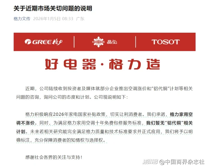 1月5日上午,格力電器就近期市場關(guān)切問題發(fā)表正式聲明,明確表示:格力家用空調(diào)不會漲價,且目前暫無采用“鋁代銅”技術(shù)的計劃。