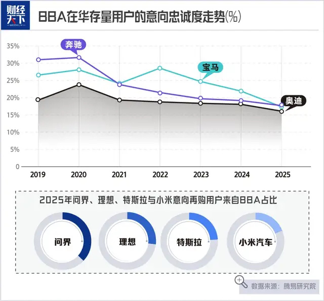 騰易研究院發(fā)布的報告顯示,2021年至2025年,BBA的意向忠誠度不約而同跌破18%,即100個BBA再購用戶中,想繼續(xù)買BBA的數(shù)量不到18個。