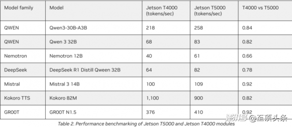 Jetson T4000的升級(jí)款Jetson T5000性能更強(qiáng),達(dá)到2070TFLOPS的算力輸出(依舊是FP4)。從實(shí)際推理性能來(lái)看Jetson T5000 相比 T4000 在多款大模型推理中均有提升:Qwen 3 30B-A3B提速19%,Qwen 3 32B提速22%,Nemotron 12B表現(xiàn)最亮眼,速度提升53%;DeepSeek R1 Distill Qwen 32B加速28%,蒸餾模型適配性明顯改善。輕量級(jí)模型 Mistral 3 14B和GR00T N1.5分別提速 9%,整體體現(xiàn)出T5000 在大模型與定制化模型場(chǎng)景的全方位優(yōu)化。