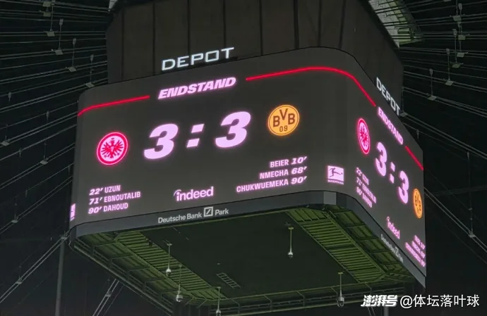 凌晨三點半的德意志銀行公園球場,當達胡德在92分鐘的抽射劃破夜空,法蘭克福球迷的歡呼幾乎要掀翻看臺;可僅僅三分鐘后,丘庫埃梅卡的一腳推射,又讓主場的喜悅瞬間凝固。3-3,這場德甲第16輪的巔峰對決,用最極致的反轉(zhuǎn)演繹了足球的魅力,也為法蘭克福這支常年被“遺憾”籠罩的球隊,刻下了一道兼具悲情與微光的印記。