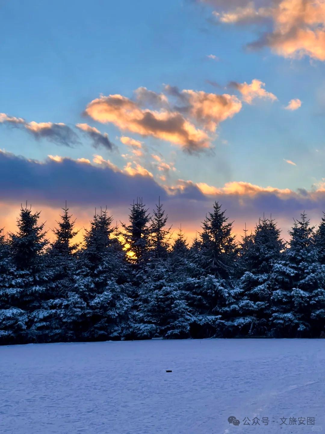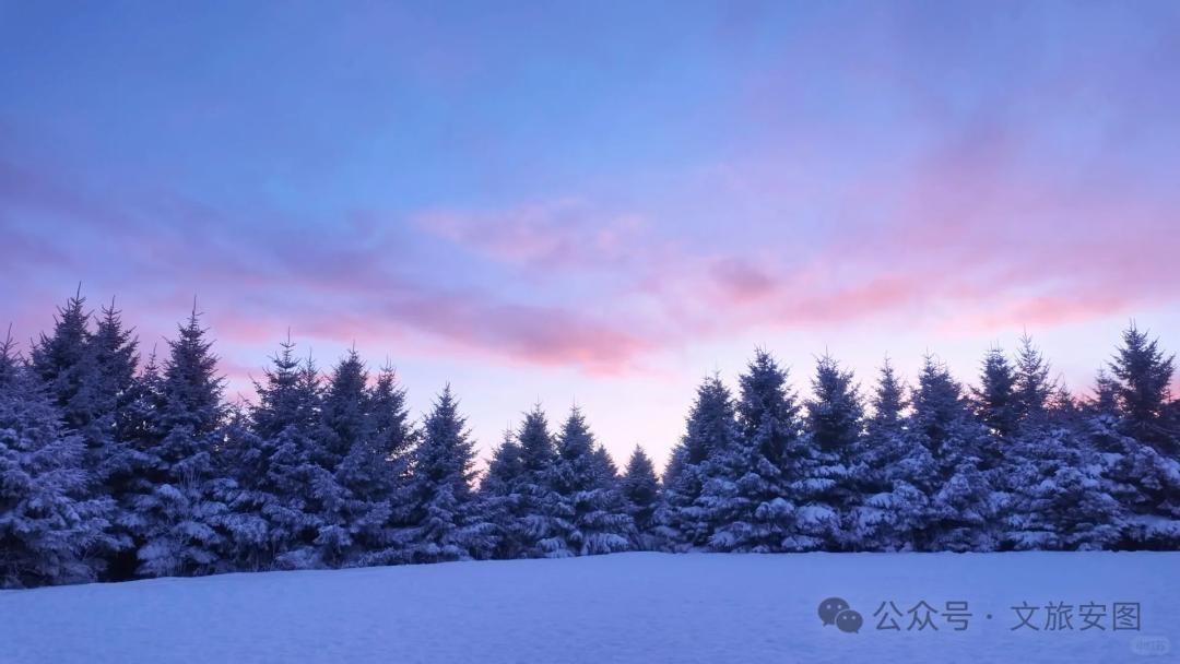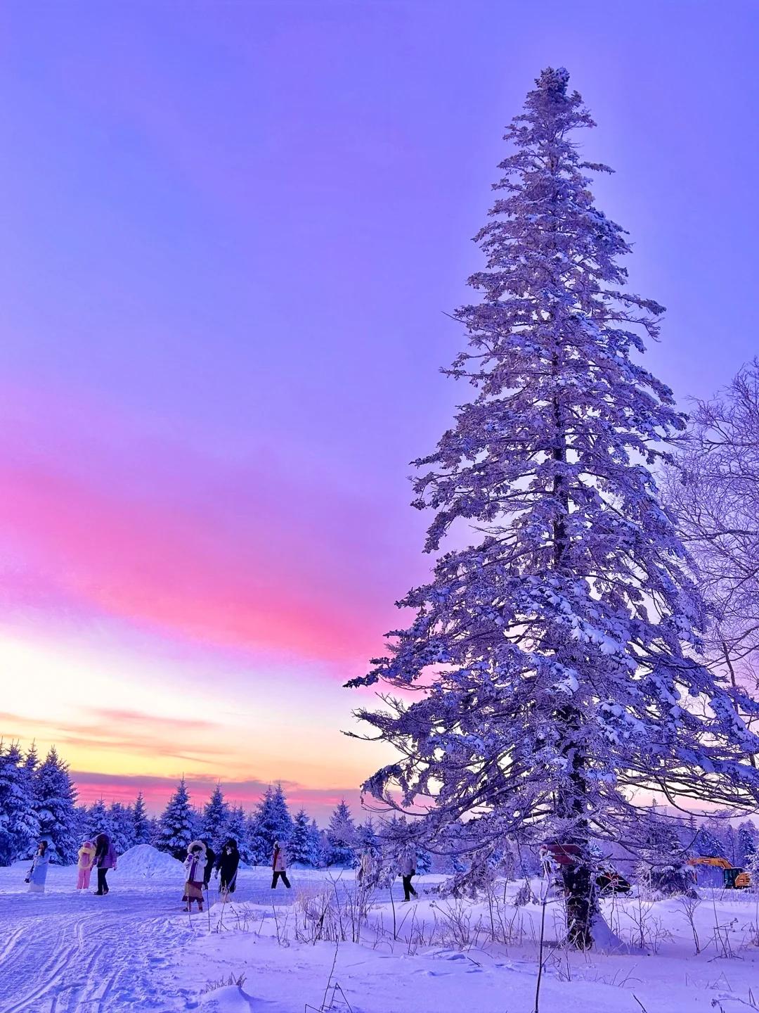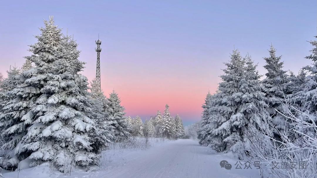 積雪接住了所有余暉。踩實(shí)的雪面揚(yáng)起細(xì)碎粉霧,遠(yuǎn)望霧凇帶如剪影,雪凇綴滿枝頭,折著粉光,像散落的碎鉆。