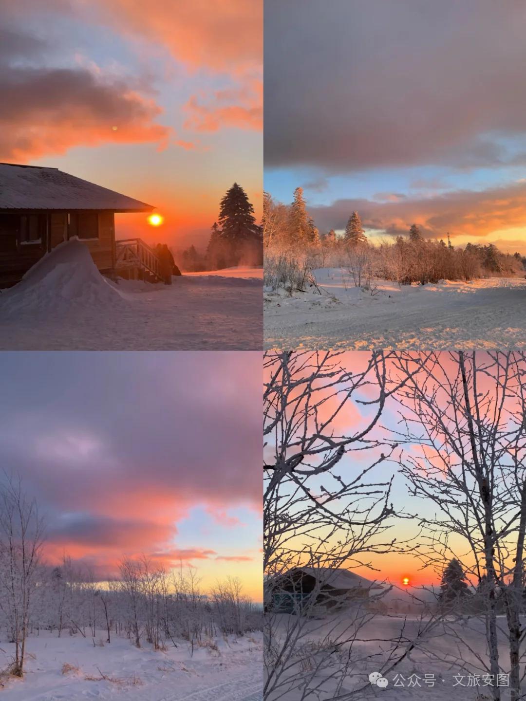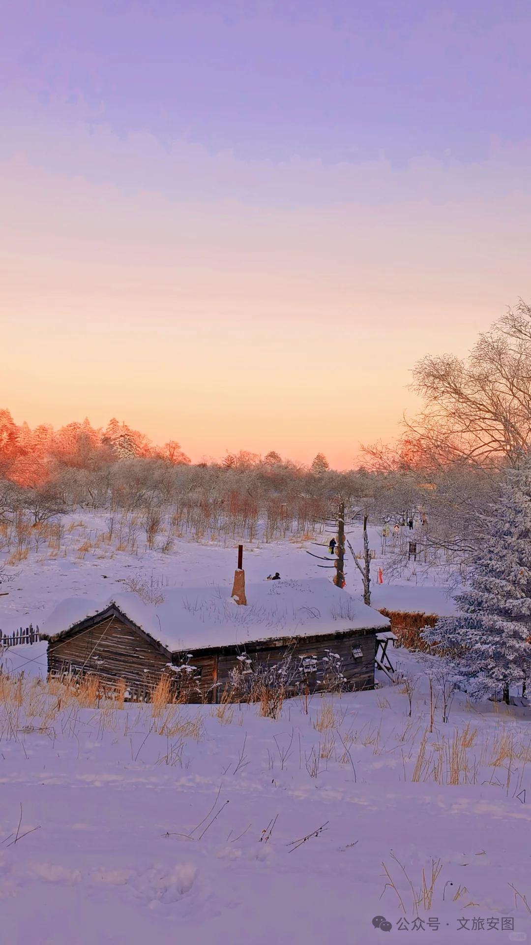站在雪嶺之上,寒風(fēng)清冽,睫毛結(jié)出冰晶。長白山主峰的輪廓在眼前展開,粉霞正漫過山脊,山下小木屋頂著厚雪,炊煙與云霞纏繞,比詩更真實(shí)。