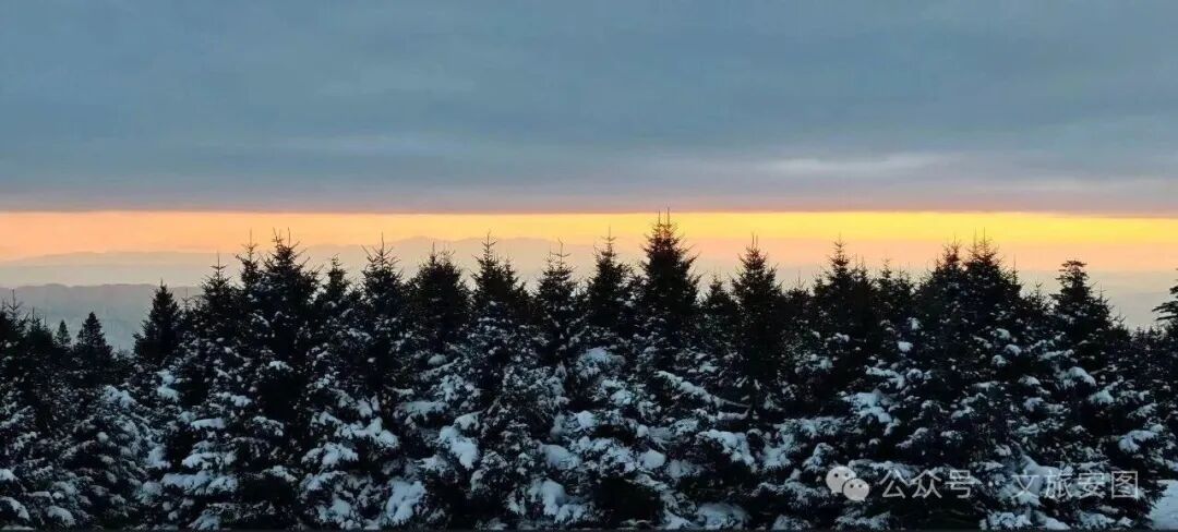日落前,是雪嶺最溫柔的時刻。夕陽把最后的光揉成粉色的絨線,繡進(jìn)云絮里:先是櫻粉,似胭脂輕掃;再暈成蜜桃色的霞,漫過雪山;最后凝作暖橘的光斑,墜在掛雪的松枝上。